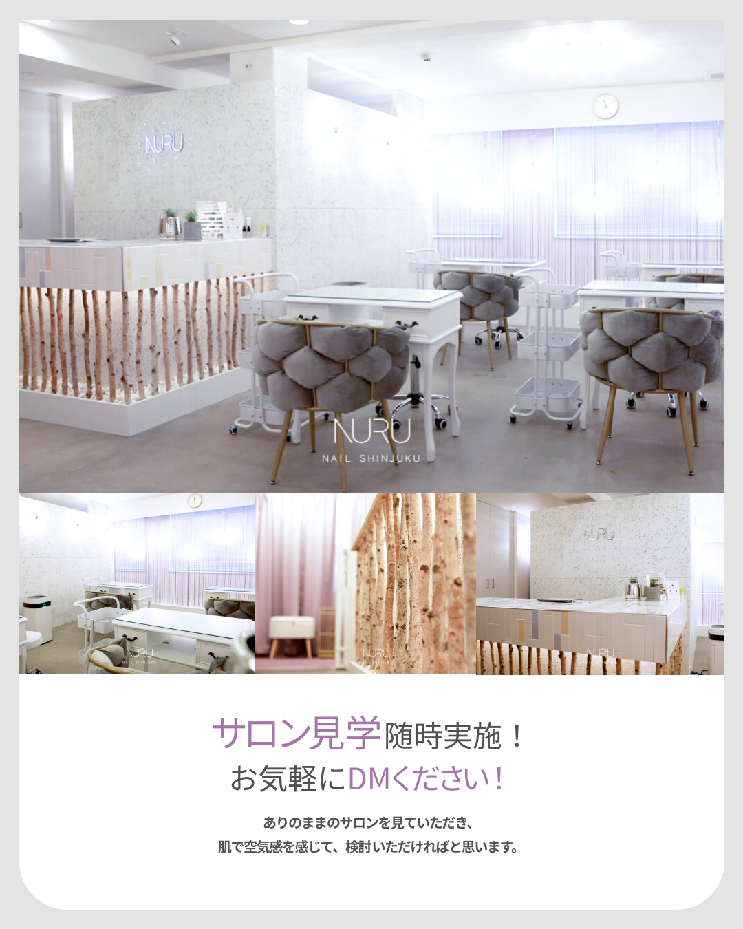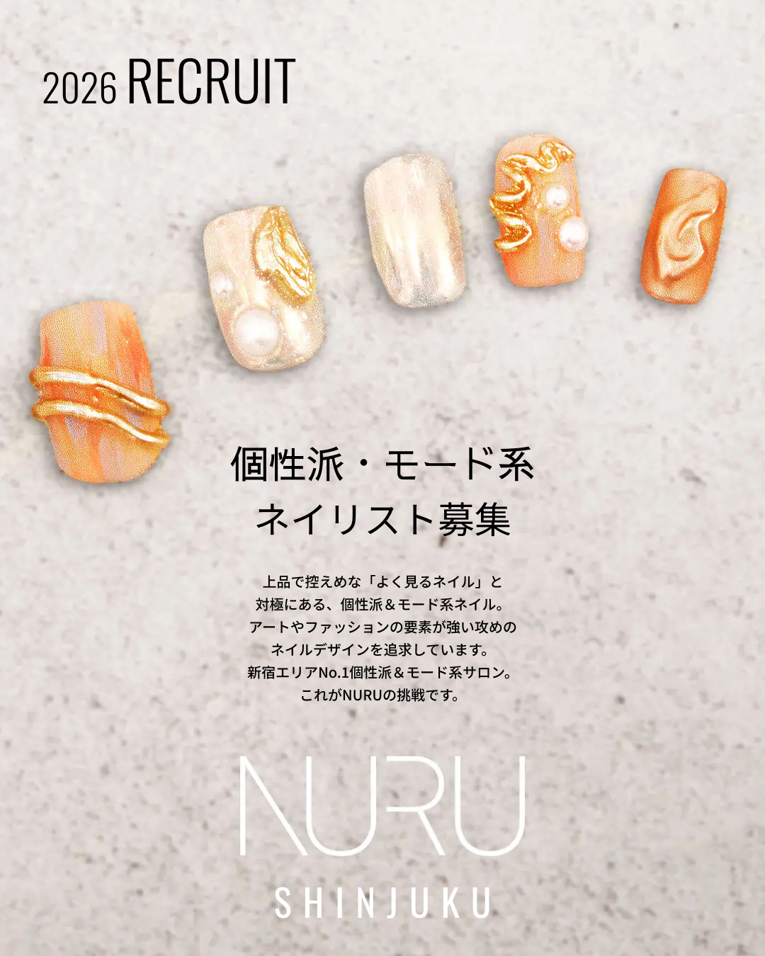 新宿ネイルサロン NURU NAILへようこそ。新宿駅西口から徒歩6分、個性派・モード系デザインが得意なネイルサロンです。