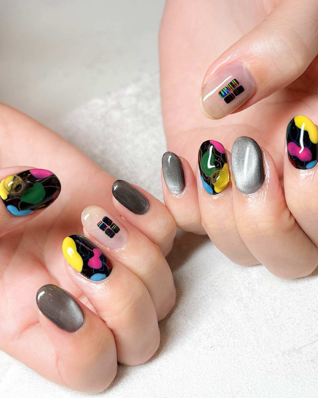 NURUのブルベ向けアンニュイニュアンスネイル。イエロー×ブルーグリーンのアンニュイな色味に、シルバーラメで上品さをプラス。ストリート・カルチャーシーンにも映える、マネしたくなる個性派カラーリング。…