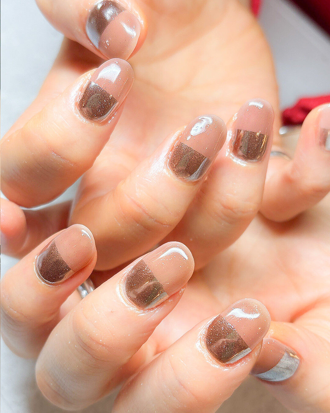 ミルクチョコレートのようなブラウンにゴールドラメとパールを添えた、甘くてキュートなデザイン。レッド×ブラウンのチェック柄がアクセント。デートやディナーにぴったりの、この季節ならではの指先を。MANAM