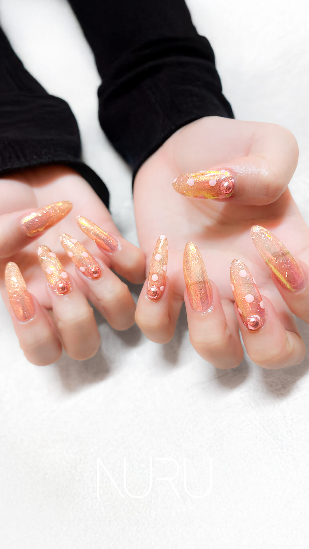 新宿ネイルサロン, オーロラオレンジ, ロングネイル, 偏光ネイル, パーティーネイル, パーツネイル, ガーリーネイル, YUMIデザイン