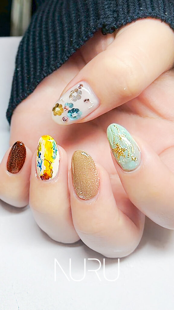 パールやビジュー、メタルパーツを使って、立体感を出してます。ただ貼るだけじゃなくて、「どこに置けば一番キレイに見えるか」を考えながら配置。これが、NURUのこだわり。