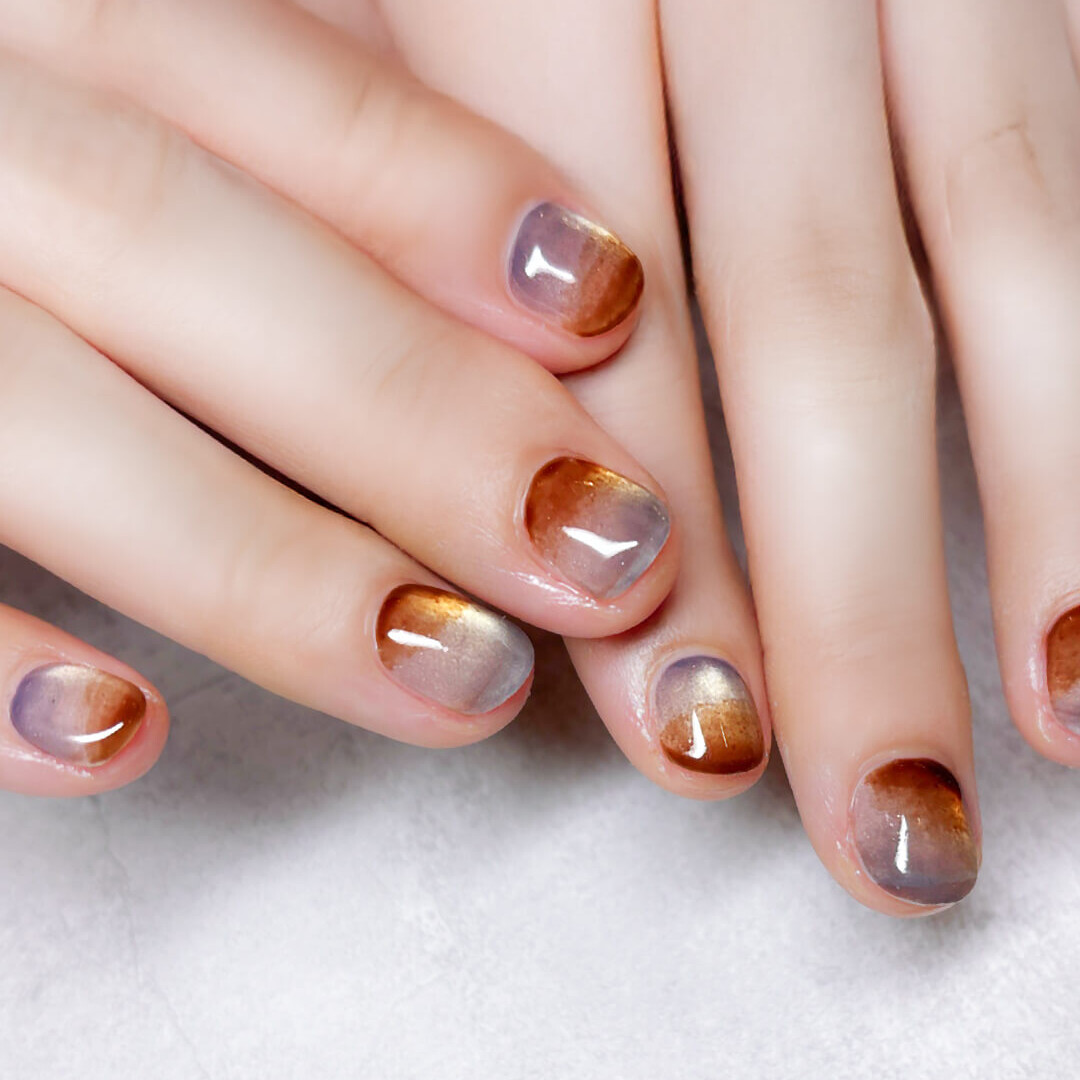 グレーとブラウンを斜めに重ね、色が溶け合う境界線に柔らかさを持たせることで、短い爪でも奥行き感のある、洗練された秋ネイルが完成しました。